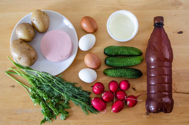 Используя традиционный рецепт окрошки с применением кваса из расчёта на четыре порции (редис (230 г), картофель (400 г), яйца (5 штук), огурцы (300 г), колбаса вареная (300 г), сметана (250 г), квас (1 л), лук и укроп по одному пучку каждого) – средняя стоимость составит 524 руб. – на 10% дороже, чем в 2020 году.